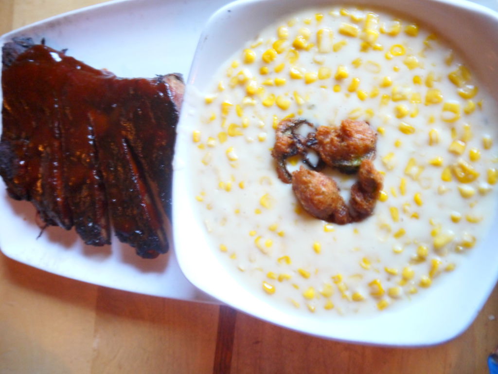 老公點的Baby Back Ribs和辣辣的玉米湯也都很好吃~ Jalapeño 配上玉米湯真是太對味了